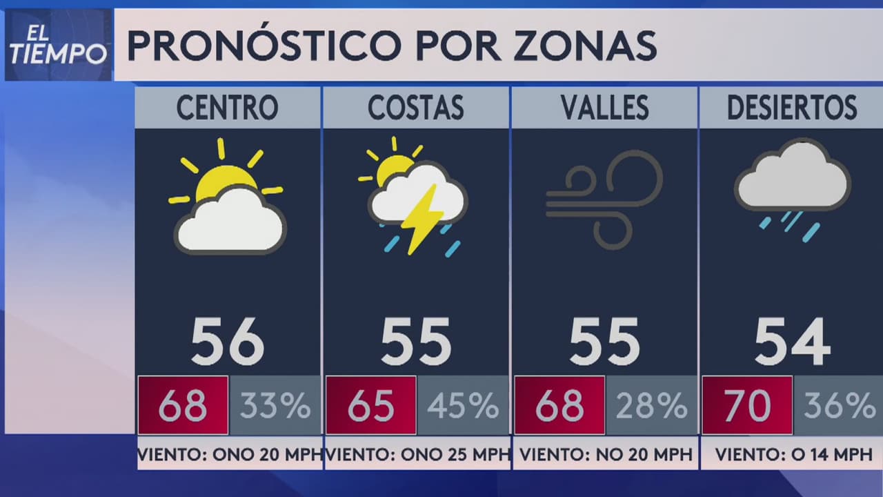 El pronóstico indica que habrá un cambió drástico en el tiempo desde el sábado hasta fines de la próxima semana, pues "una serie de tormentas traen un clima mucho más frío y períodos de lluvia y nieve de montaña al área", según el NWS. La primera tormenta traerá lluvias y nevadas en las montañas de viernes a sábado, y "los niveles de nieve bajarán a 3500-4000 pies el viernes por la noche, informó el NWS. Además, se espera nieve ligera sobre los principales pasos de montaña, con posibles impactos en los viajes a través de las montañas.