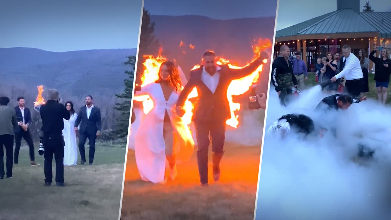 Como se aprecia en el video que se hizo viral, los novios se prendieron fuego para el momento de la salida a la recepción de su boda.