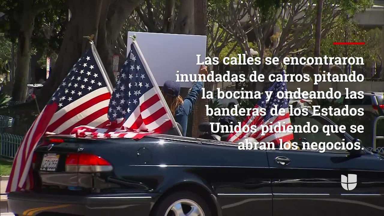 Varios manifestantes en sus vehículos rodearon el edificio del Ayuntamiento de Los Ángeles con pancartas y banderas de Estados Unidos exigiendo se reactive la economía local y se suspendan las medidas del distanciamiento social y la cuarentena implementada para disminuir los contagios del coronavirus en la ciudad.