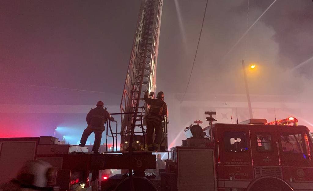 Bomberos del Departamento de Bomberos de Los Ángeles luchan para contener las llamas en un edificio comercial de dos pisos en el centro de la ciudad. El incidente se reportó poco antes de las 6:00 p.m. de este miércoles en la cuadra 500 de 9th Street, cerca de Wall Street. Los bomberos lograron contener el avance del incendio y buscan eliminar los focos de fuego.