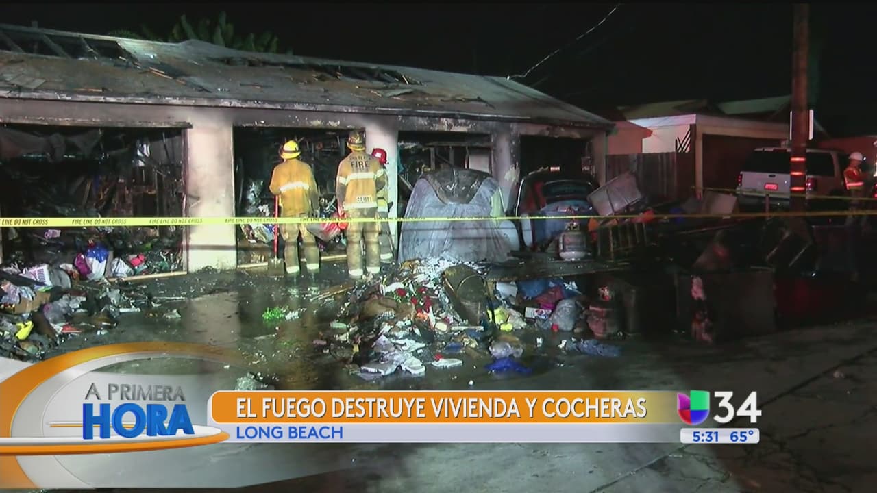 Bomberos respondieron a la escena de un incendio que destruyó múltiples cocheras en una zona residencial de Long Beach.