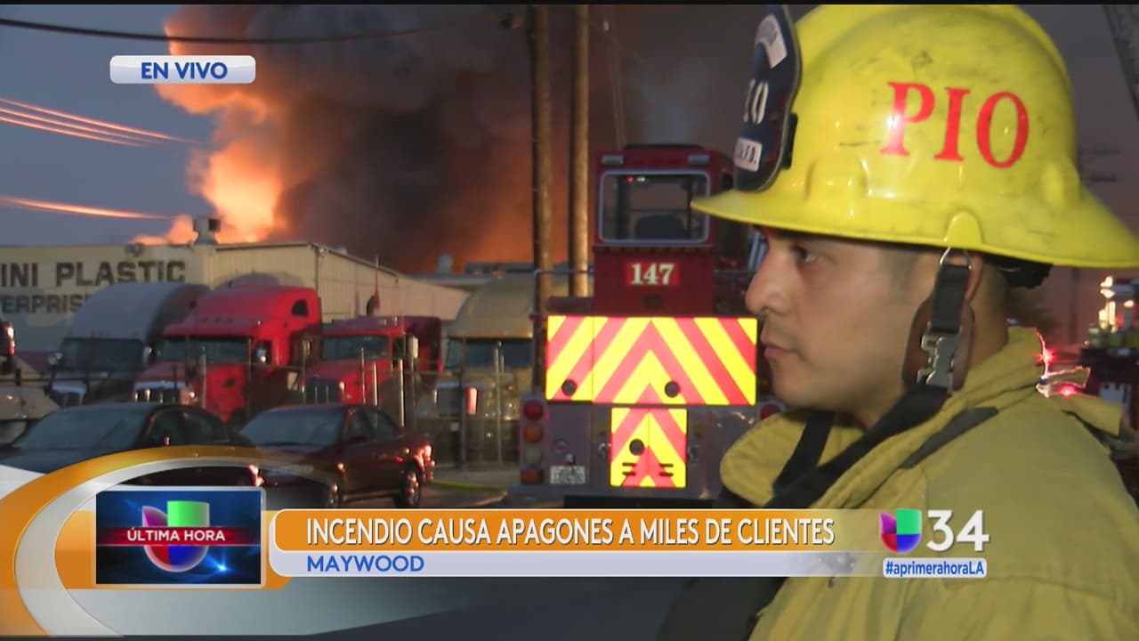 Bomberos combaten un voraz incendio, de tres alarmas, que se desató la madrugada del martes en una bodega ubicada en la ciudad de Maywood.