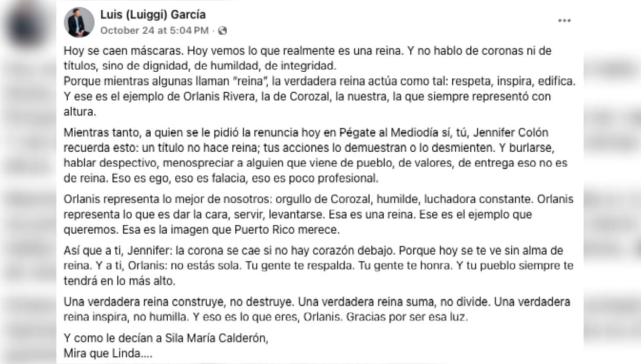 Luis García, alcalde de Corozal, pueblo al que Orlanis Rivera representó en el certamen, tronó contra las expresiones de Jennifer Colón, publicando su sentir a través de Facebook.