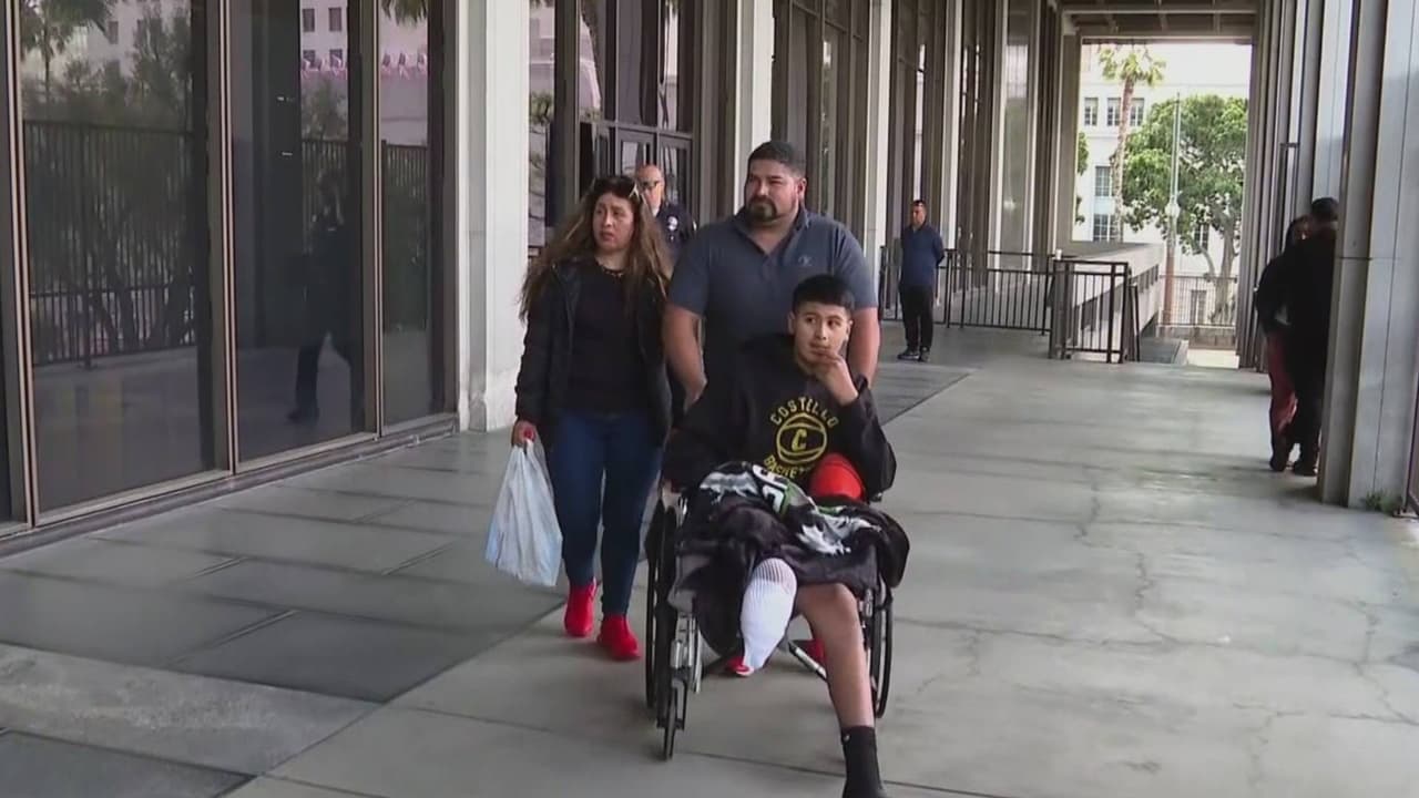 Joshua Mora, de 13 años, fue atropellado por un motorista el pasado 30 de marzo. Por el accidente, le amputaron el pie derecho. En pleno proceso de recuperación se presentó este martes el tribunal Superior en Los Ángeles, donde junto a sus padres esperaba que enjuiciaran al motorista que lo atropelló. Salieron "frustrados" porque aún no hay pruebas suficientes para lograrlo.