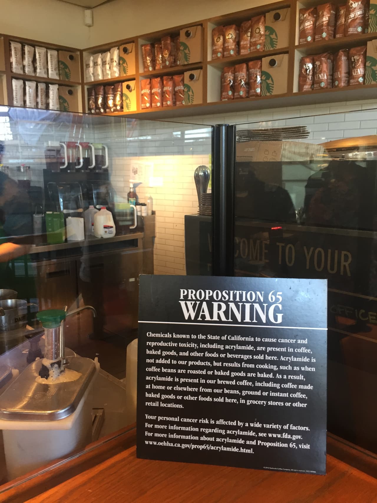 Actualmente en los café como Starbucks esta advertencia aparece en carteles dentro del local (no en los vasos o productos directamente) donde señalan que de acuerdo a la propuesta 65 "químicos conocidos por el estado de California como causantes de cáncer, incluyendo acrilamida, están presentes en el café, cosas horneadas y otros alimentos y bebidas vendidos aquí".