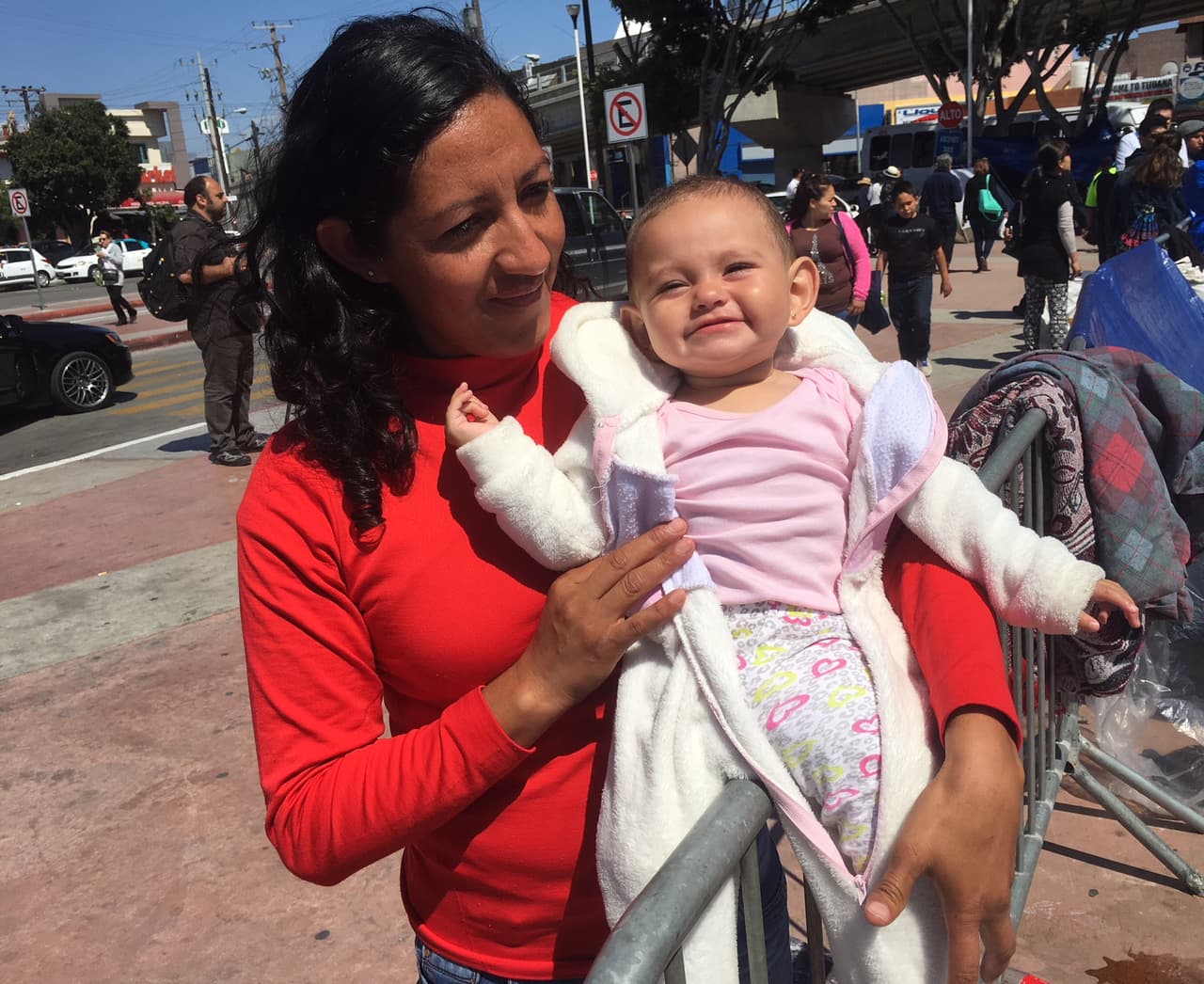 Leticia se encontró con una vecina de Maravatío en el acceso de la garita de San Ysidro. Es Virginia Colín, de 36 años y quien trajo a su bebé, Ximena, de 9 meses. Ahí se reunieron las dos para contarse sus penas. Virginia asegura que la razón de su salida es la falta de oportunidades. Trabajaba limpiando casas por un sueldo de 100 pesos (5 dólares) diarios, hasta que se embarazó y no le quisieron seguir dando el empleo.