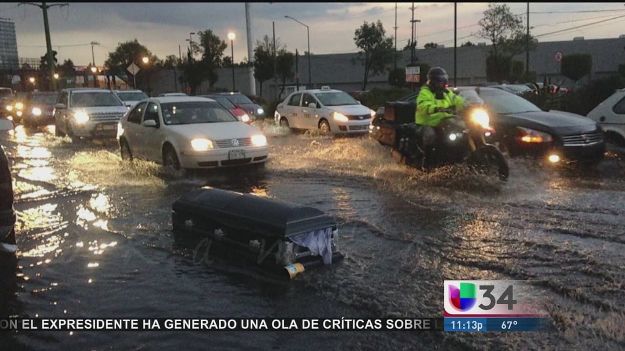 Lluvias arrastran un ataúd por las calles de México
