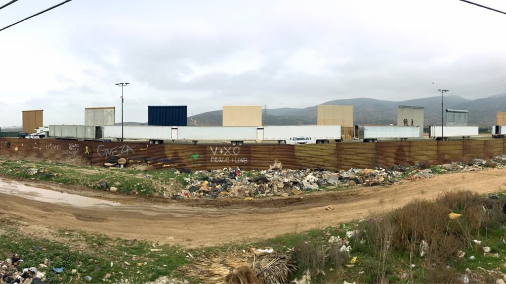 Y es que ocho cajas de tráiler fueron colocadas entre la valla fronteriza y los prototipos del muro para impedir que el escenario donde se presentaría Trump fuera visto desde lado mexicano.