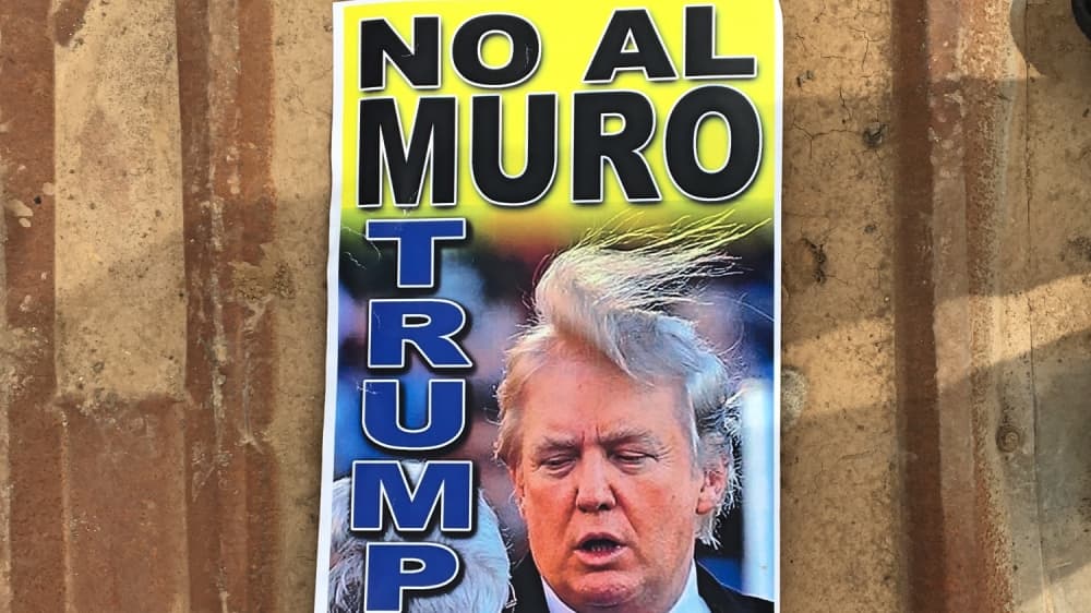 Junto a la valla metálica quedaron colgadas algunas mantas mientras que una pancarta de papel –que tenía inscrita la frase "No al muro de Trump" y la imagen del presidente con el copete desgreñado por el viento– se sumaba al montículo de basura, de llantas usadas, escombro, trozos de alfombra, bolsas de plástico con desechos domésticos, muebles destrozados y otros desperdicios de cartón y vidrio.