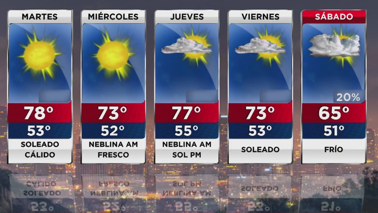 El paso de un sistema de alta presión dejará temperaturas máximas de 78 grados Fahrenheit, mínimas de 53 y cielos mayormente despejados. Los vientos estarán moderados y no hay probabilidades de lluvia.