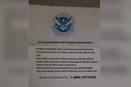 El falso documento que se ha difundido en esa zona afirma que ICE llevará a cabo incursiones en negocios y viviendas en las áreas de Porterville y Terra Bella del 15 de septiembre al 15 de octubre.