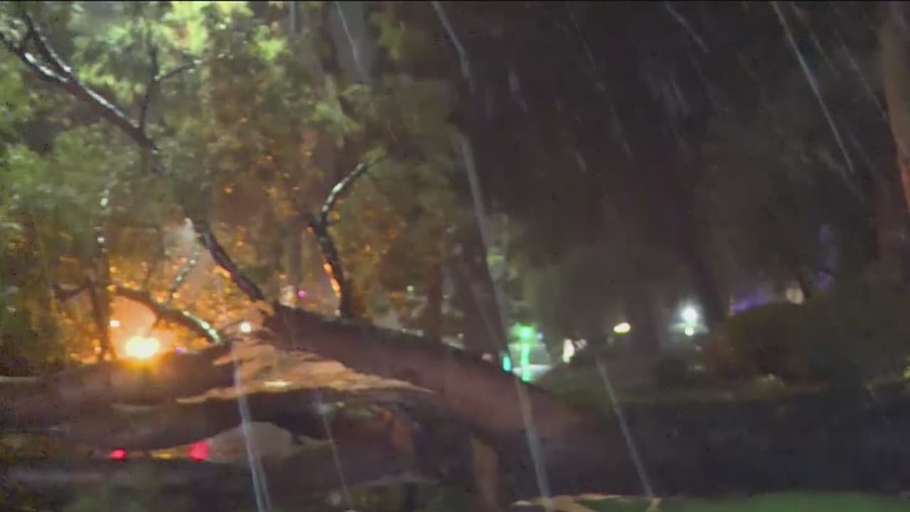 Los fuertes vientos provocan la caída de un árbol frente a un complejo de apartamentos en Woodland Hills