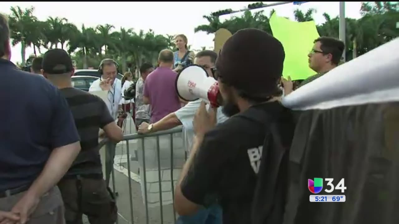 Decenas de personas participaron en protestas en favor y en contra de Donald Trump, mientras el candidato republicano a la presidencia llegó a un evento en Miami.
