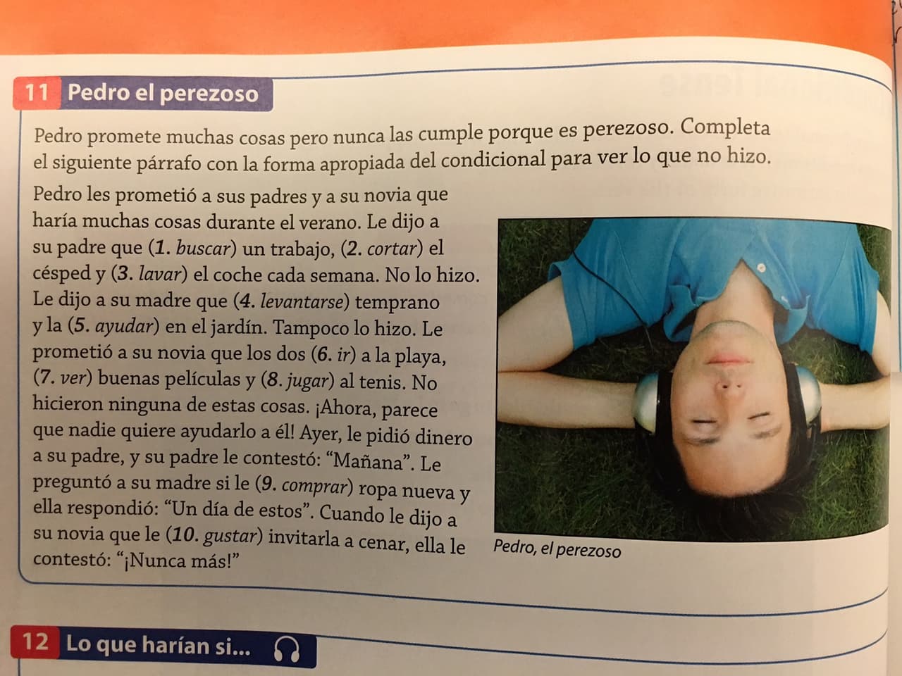 "Pedro promete muchas cosas pero nunca las cumple porque es perezoso", así comienza un ejercicio para que los estudiantes practiquen la formación de los verbos en condicional, un ejemplo del argumentario utilizado para que los estudiantes practiquen su español.