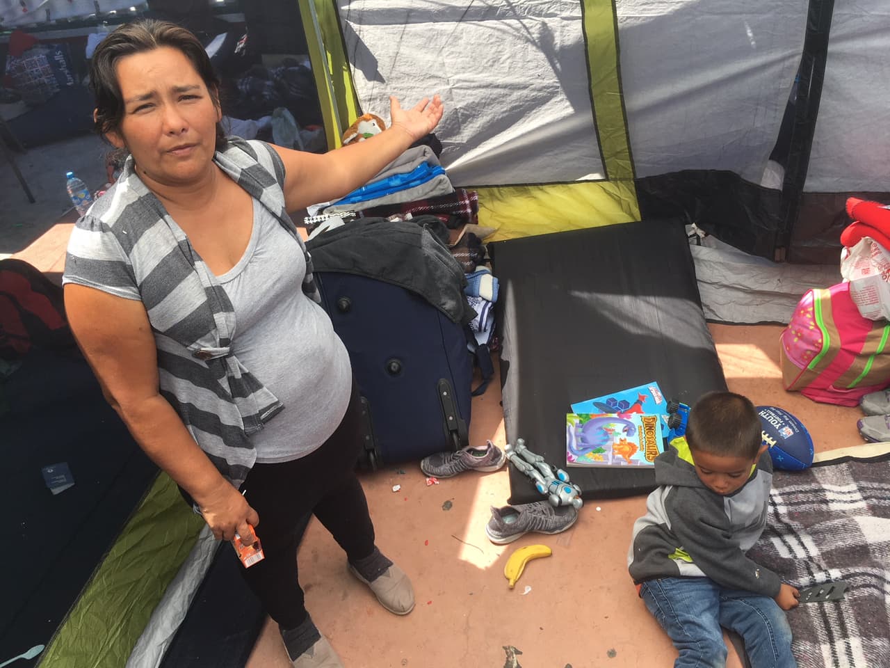 Kenia, de 35 años, viene huyendo de su marido que la golpeaba y cuya familia está ligada a la Mara Salvatrucha (MS-13). Vino en la caravana migrante con sus tres hijos, de entre 4 y 9 años. Ella contó que también ellos fueron víctimas de la violencia del padre. Como prueba, ella trajo los reportes de violencia doméstica que interpuso en Honduras cuando le pegó su esposo.