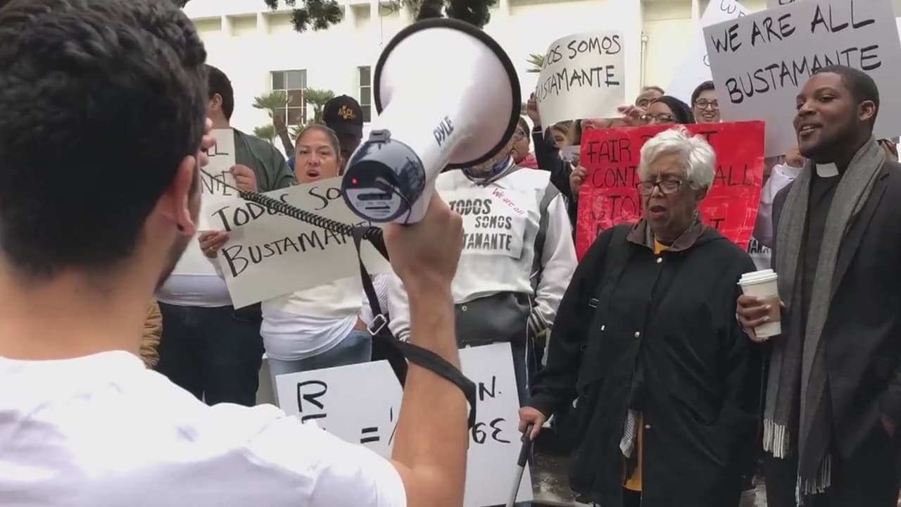Decenas de personas se congregaron frente a la Corte de Santa Mónica para abogar por Alberto Bustamante, Ángela Sandoval y sus tres hijos que enfrentan un tercer desalojo. Durante la protesta, los activistas recalcaron la profunda crisis de vivienda asequible.