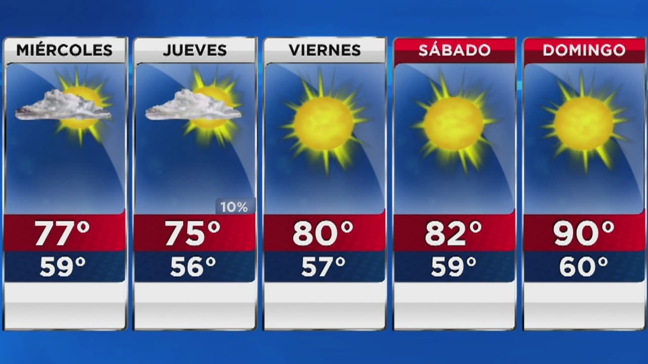 La temperatura estará un poco más baja que en días pasados, con una máxima de 77 grados. Habrá un poco de nubosidad y viento. Siguen los problemas de calidad del aire como consecuencia de los incendios en el estado.