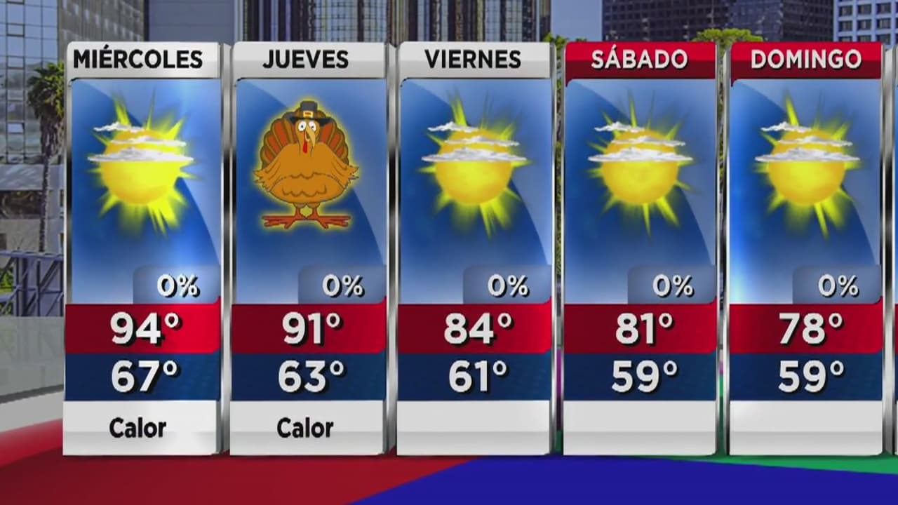 La temperatura máxima para hoy en la ciudad será de 94 grados, y en gran parte del sur de California superará los 90 grados. El cielo estará totalmente despejado y sin probabilidades de lluvia.