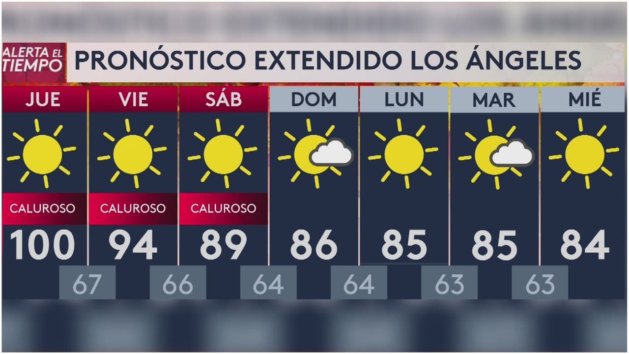 Se espera una temperatura mínima de 67 grados Fahrenheit y una máxima de 100 grados. No hay probabilidad de lluvia para este día y hay una advertencia por calor hasta el viernes.