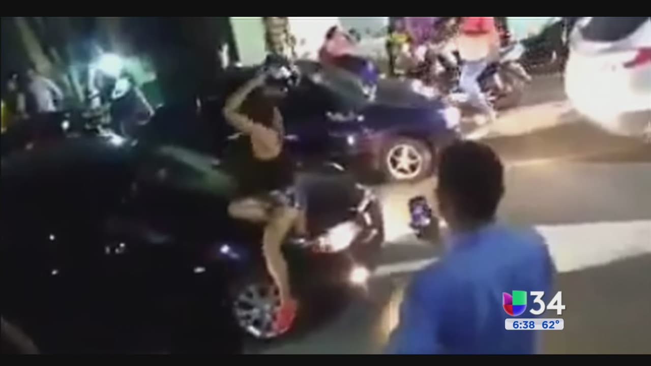 El video muestra a una mujer golpeando con un casco el vidrio panorámico de un auto en el que presuntamente viajaba su esposo con su amante.
