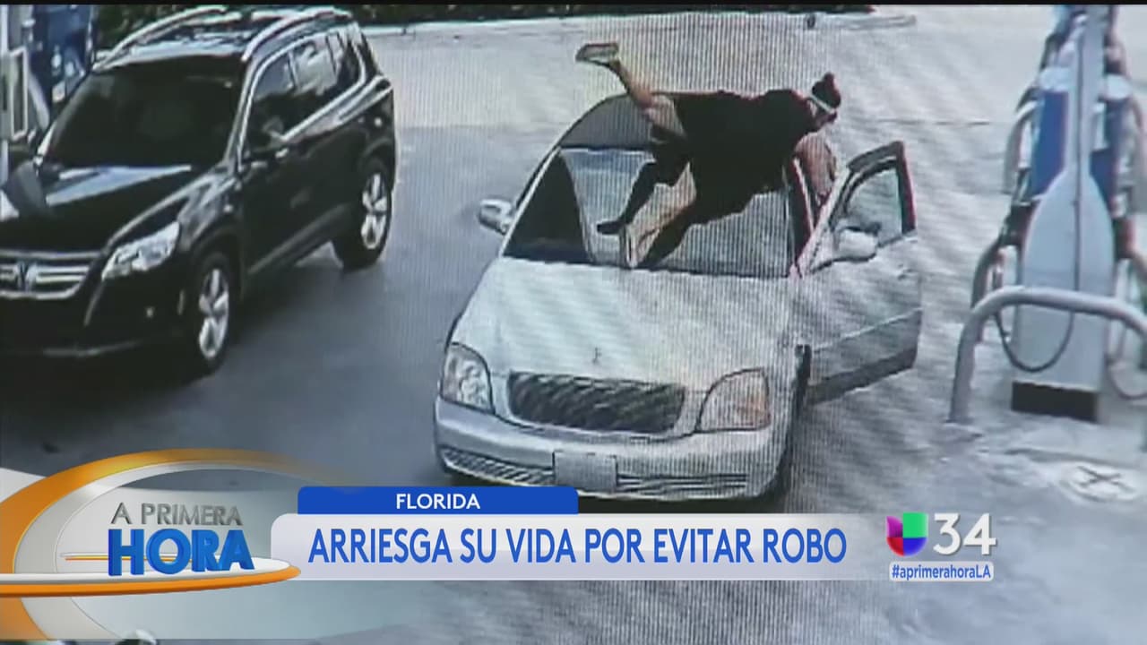 Cámaras de seguridad captaron el momento que una mujer se lanzó sobre el auto de un presunto ladrón. La víctima del robo resultó herida en el incidente.