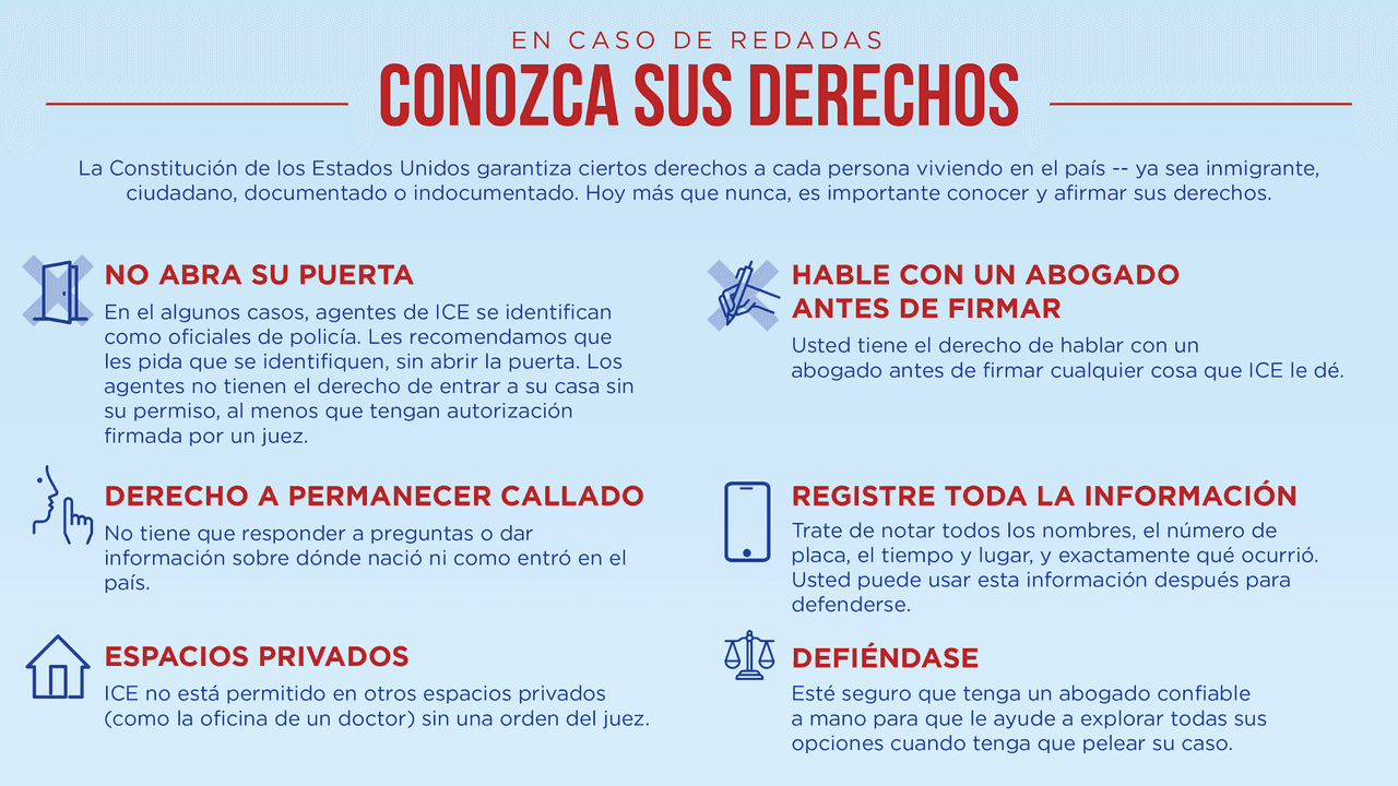 Si usted tiene que tratar con oficiales de inmigración y Control de aduanas (ICE), en la casa, calle o en algún otro lugar, recuerde que: