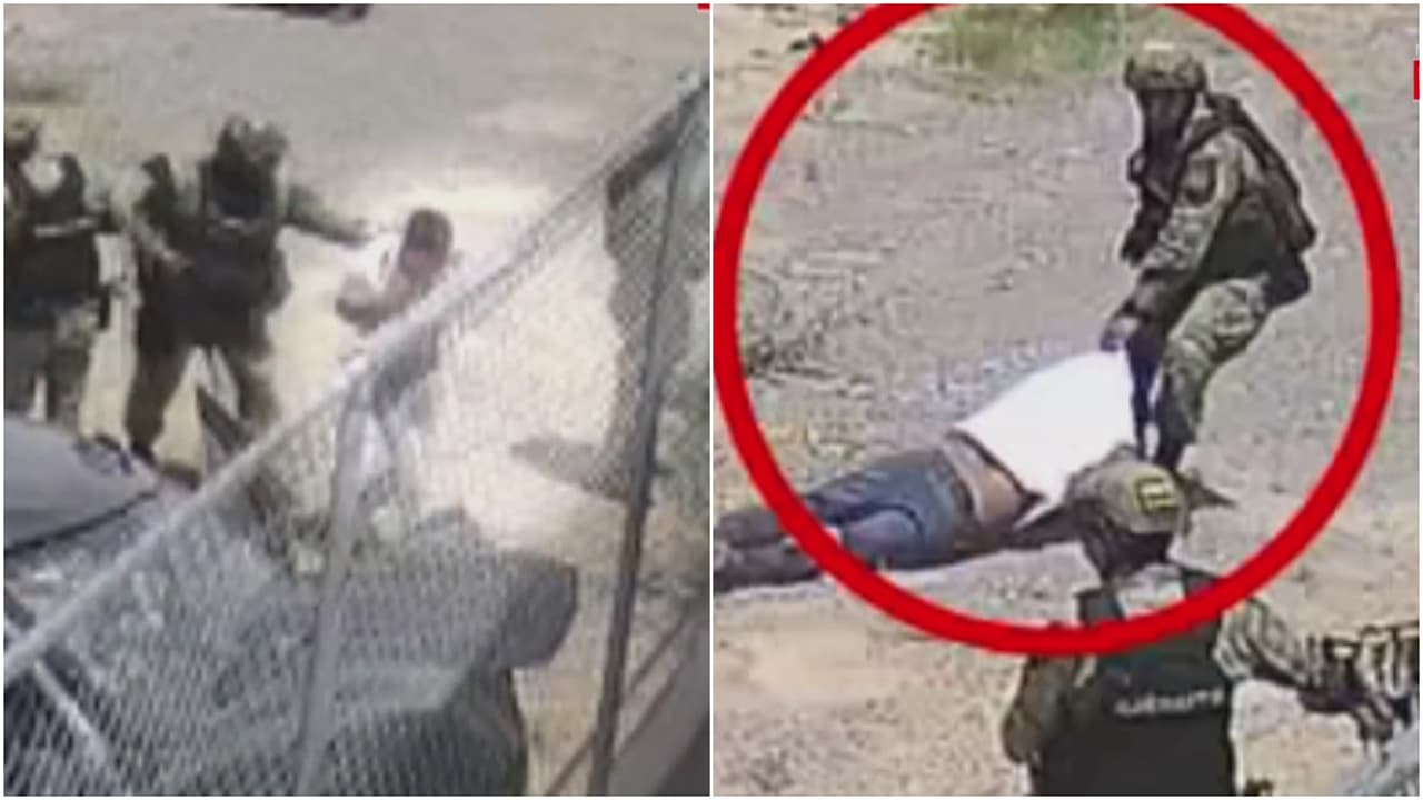 Los 11 militares que llegan al lugar se van acercando a la camioneta, uno de ellos dispara a la llanta delantera, otro al piso, entonces proceden a sacar a los cinco ocupantes. a uno de camiseta negra uno de los soldados lo lanza al suelo de una patada donde recibe una paliza.