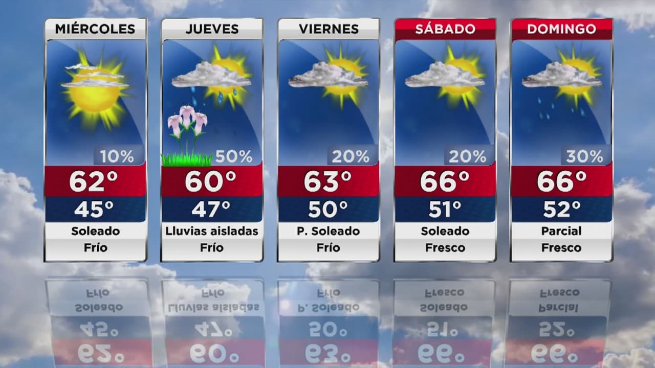 Las primeras horas de la jornada estarán marcadas por cielos mayormente nublados que se irán despejando con el transcurso de las horas. Las temperaturas máximas llegarán a los 62 grados Fahrenheit y las mínimas se ubicarán en los 45.