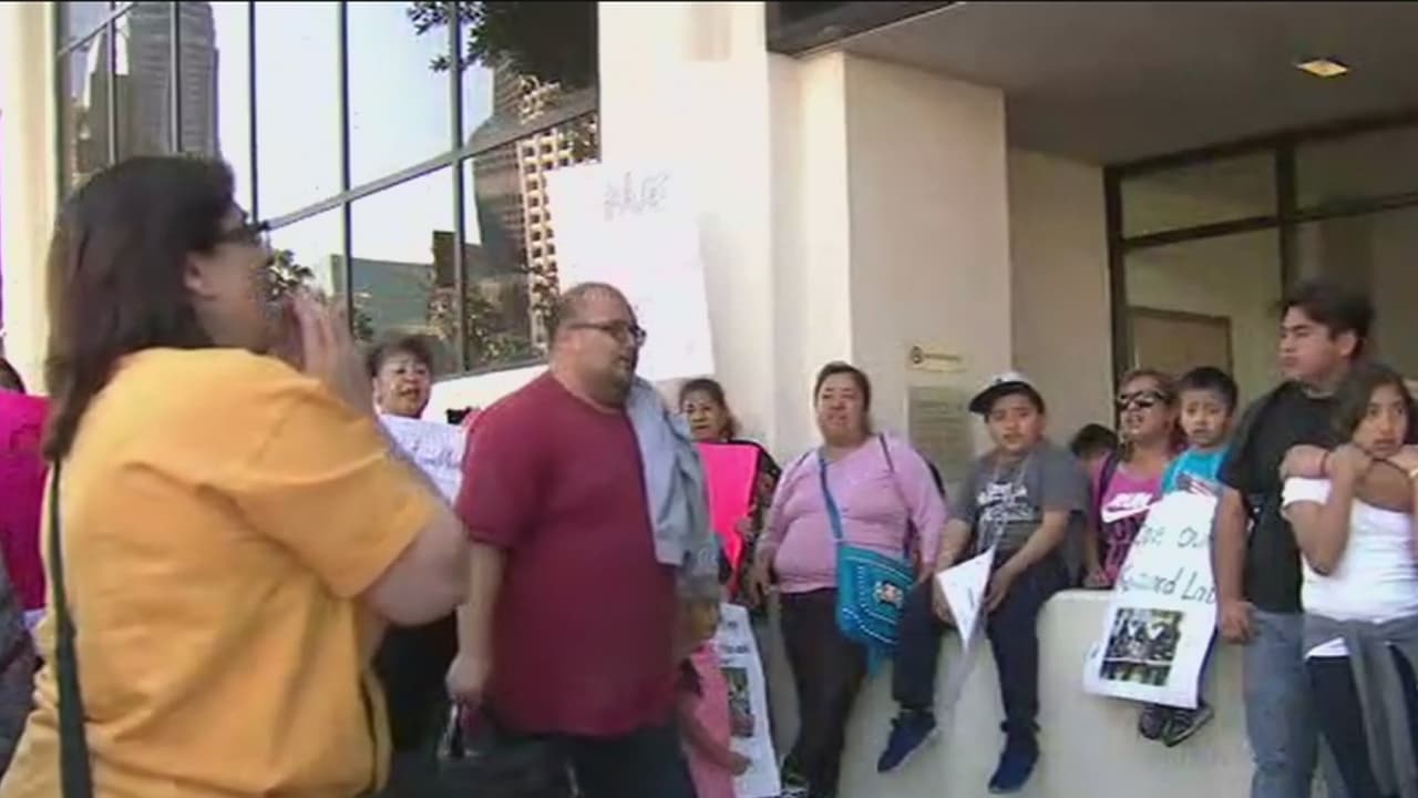 Decenas de personas protestaron a las afueras de las oficinas del distrito escolar y exigieron que el próximo 1 de mayo los alumnos no tengan que ir a clase para que puedan apoyar el Día Internacional de los Trabajadores.
