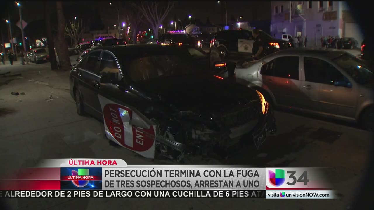 La policía persiguió desde Glendora hasta el centro de Los Ángeles a tres sujetos que abandonaron el vehículo en el que viajaban después de chocar contra un señalamiento. Dos lograron huir de las autoridades.