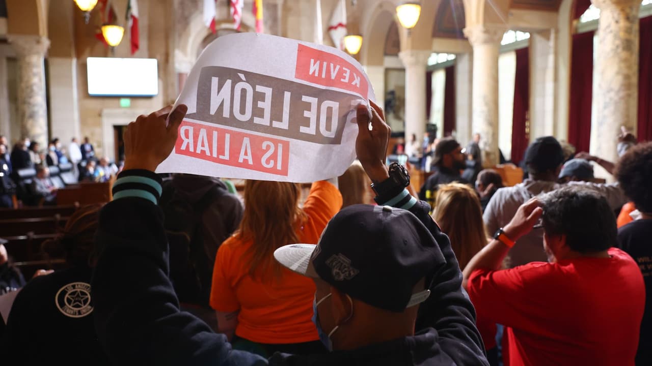 El concejal Kevin de León se presentó este viernes en el Concejo Municipal de Los Ángeles y el presidente de dicha corporación, Paul Krekorian, tuvo que ordenar un receso de aproximadamente 45 minutos para calmar a los asistentes que pedían que el funcionario se retirara del recinto. Esta es la primera vez que De León aparece en una sesión del Concejo desde octubre pasado cuando se filtró una grabación con comentarios racistas que salpicó a varios políticos.