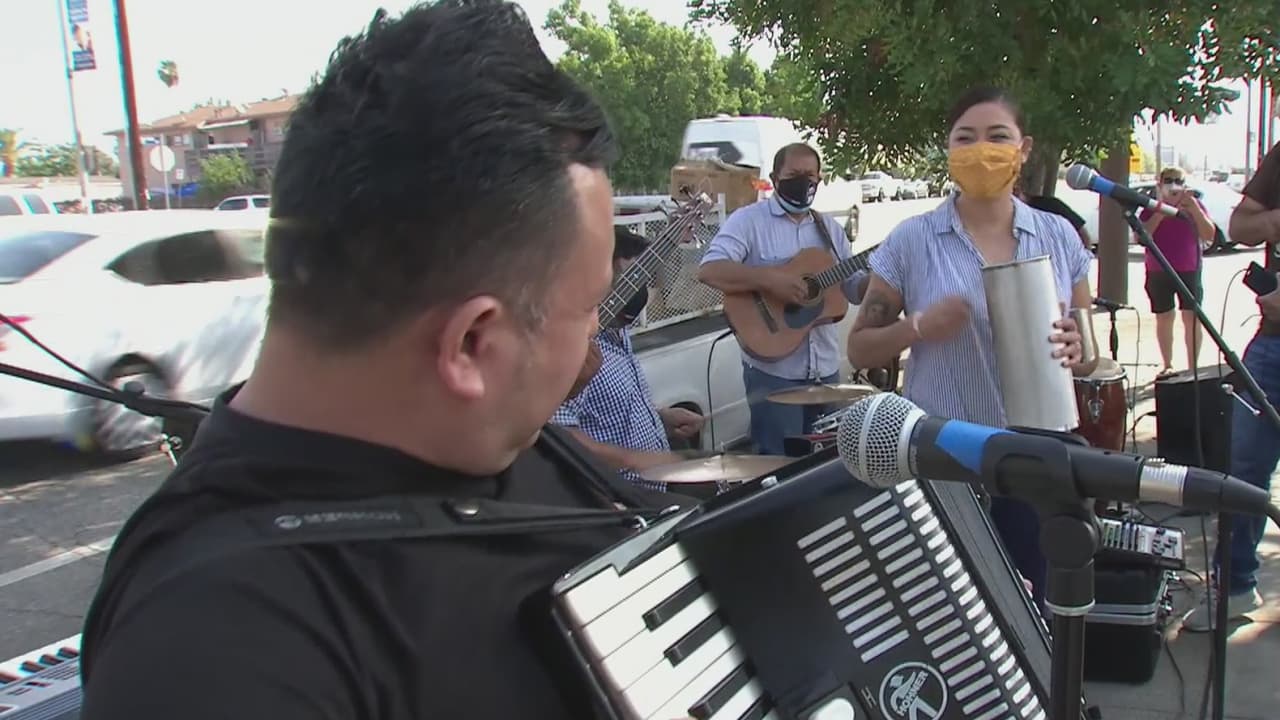 Desde una esquina en North Hollywood este grupo musical usa ritmos populares para transmitir el tema en California. "Al tiempo que estamos viviendo ahorita con la pandemia le da ánimo a seguir la vida", dijo el jornalero Erik Sanciso.