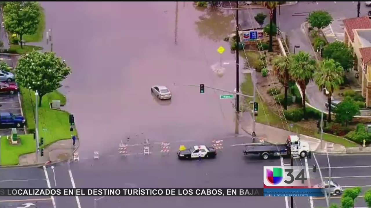 En Ontario, oficiales del Departamento de Policía tuvieron que desviar el tráfico en calles que quedaron inundadas.