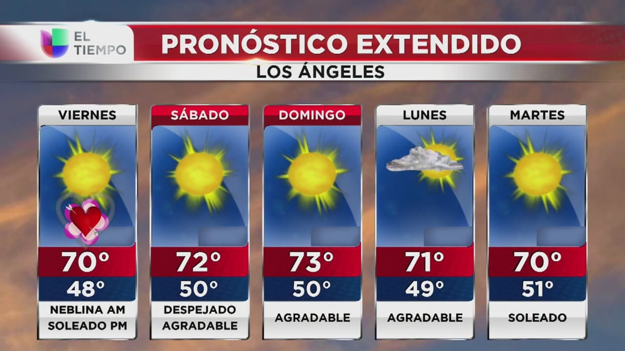 Las temperaturas máximas se ubicarán en los 70 grados Fahrenheit y las mínimas en los 48 grados. Durante el Día de San Valentín, habrá condiciones secas.