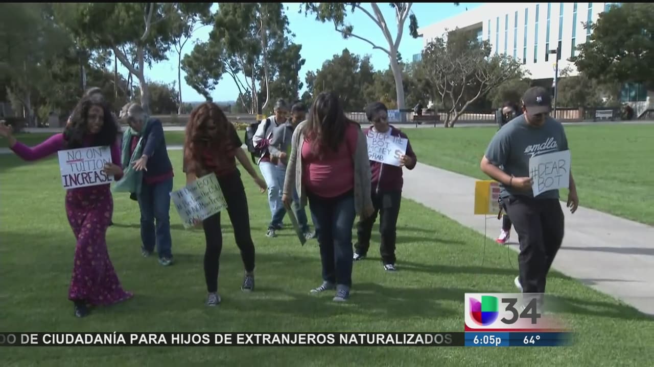 Estudiantes de la Universidad Cal State Dominguez Hill realizan una protesta para mostrar su rechazo a la posible alza del cinco por ciento en sus colegiaturas.
