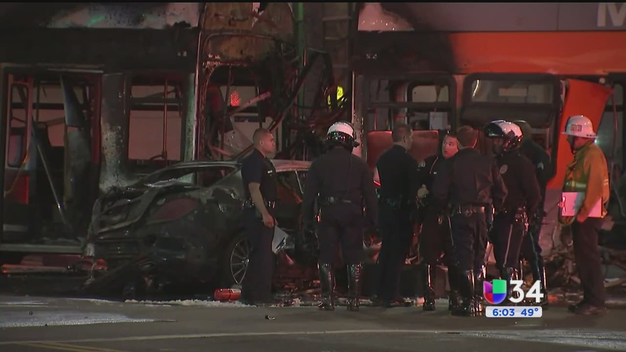 Investigadores revisaran las cámaras de seguridad para determinar que provocó un accidente entre un autobús y varios vehículos en el sur de Los Ángeles.