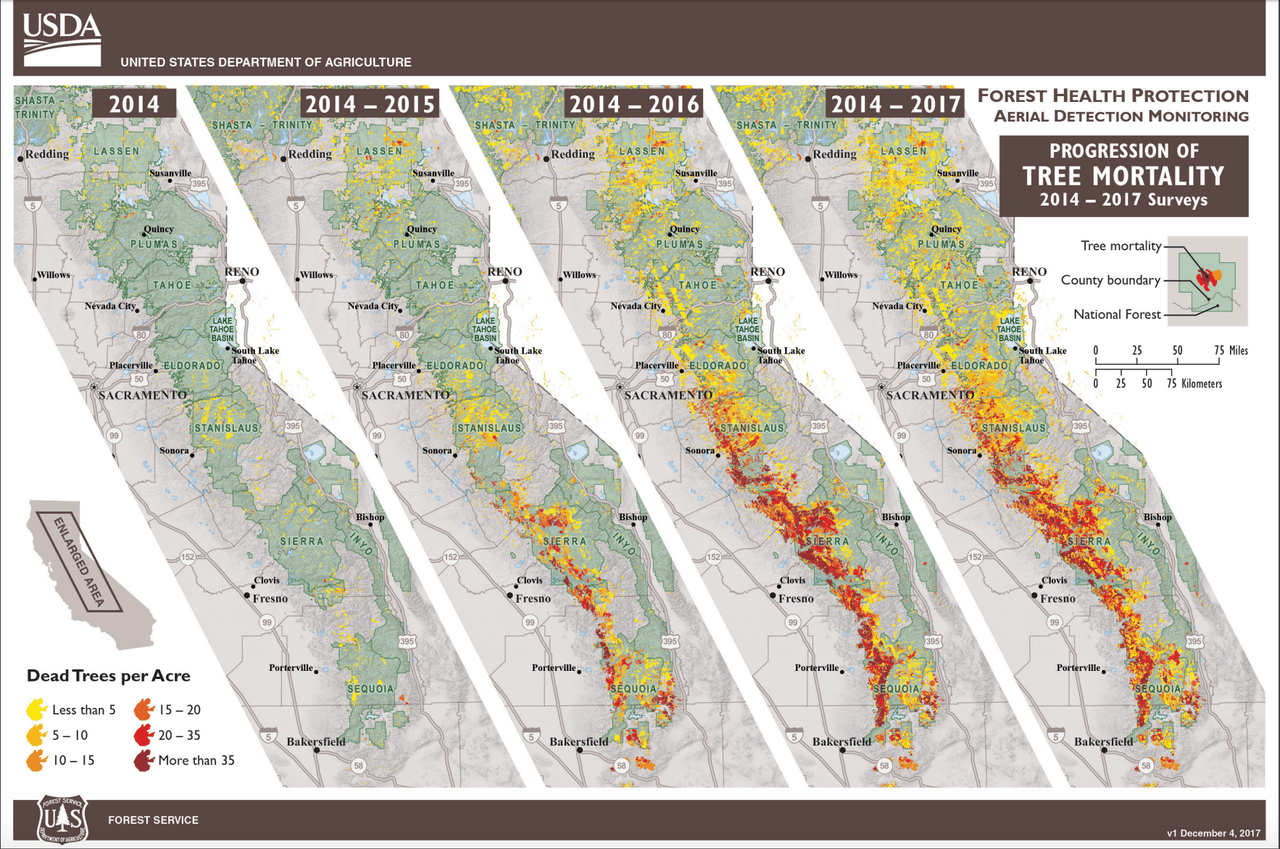 Y sí, es verdad que el pasado fue un invierno lluvioso. Más lluvia y nieve cayeron en partes de la Sierra Nevada que en los cuatro años previos combinados. Aunque algunos árboles se han recuperado y la tasa de mortalidad se está desacelerando, el agua llegó tarde para otros árboles que ya estaban agonizando.