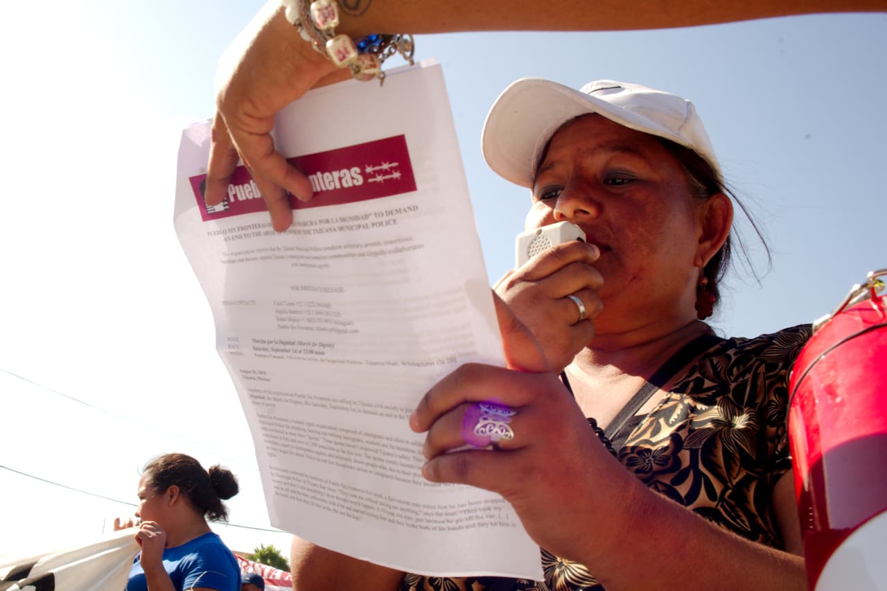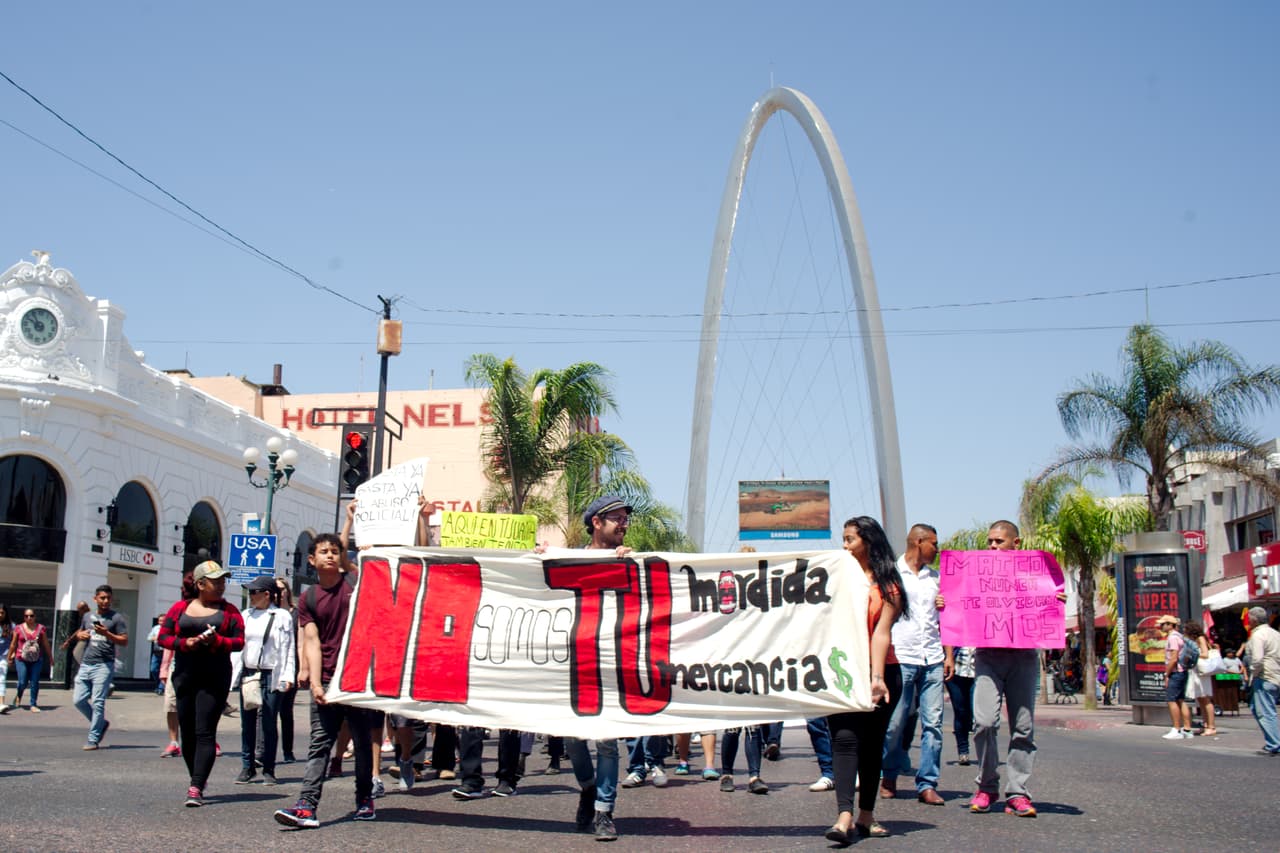 Una de las mantas con que marcharon mencionaba que en Tijuana se han cometido cerca de 2,000 homicidios y que la Policía no ha detenido a los asesinos y, en cambio, la ha emprendido en contra de migrantes a los que despoja de sus pertenencias y contra indigentes, quienes, al carecer de objetos de valor, son víctimas de agresiones.