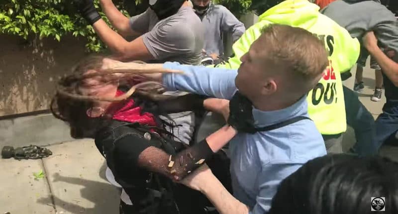 La marcha también atrajo a un pequeño contingente de manifestantes anti-Trump, incluidos algunos activistas y militantes antifa. Algunas personas decidieron bloquear físicamente la procesión mientras avanzaba por la autopista de la costa del Pacífico. En poco tiempo, la escena se volvió violenta y las peleas entre enemigos políticos barrieron la playa.