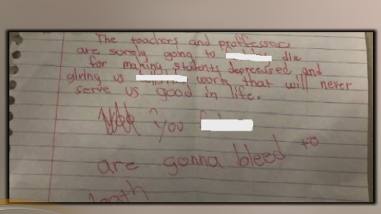 Una nota escrita a mano advierte que el 12 de diciembre habrá una balacera que cobrará la vida de muchas personas en el campus universitario. En días pasados se han encontrado otros escritos amenazantes, incluyendo símbolos de odio.