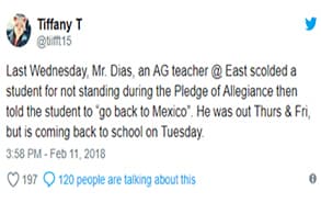 "El miércoles pasado el señor Dias, un maestro de East regañó a una estudiante por no ponerse de pie durante el juramento a la bandera y luego le dijo a la estudiante "regresa a Mexico". No fue el jueves ni el viernes, pero regresa a la escuela el martes", escribió Tiffany Trang en su cuenta de Twitter.