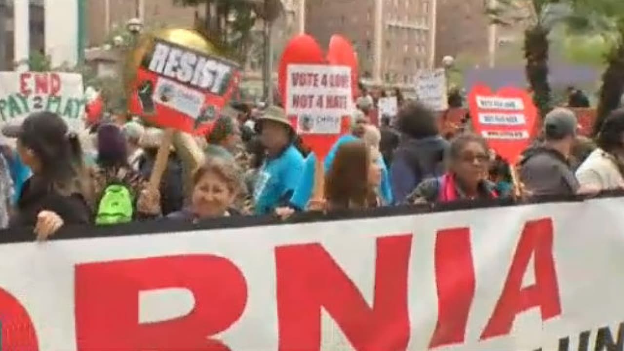 Al frente de la marcha varios activistas sostenían una manta donde se leía: "California. Sin miedo y unidos". Otros sujetaban un enorme cartel con la palabra "Resiste". Otros grupos exigían entre tambores y gritos la legalización de los vendedores ambulantes en esta ciudad, protestaban contra el abuso policial, pedían mejores condiciones laborales (el 1 de mayo es el Día Internacional del Trabajo) y abogaban por la comunidad LGBT.