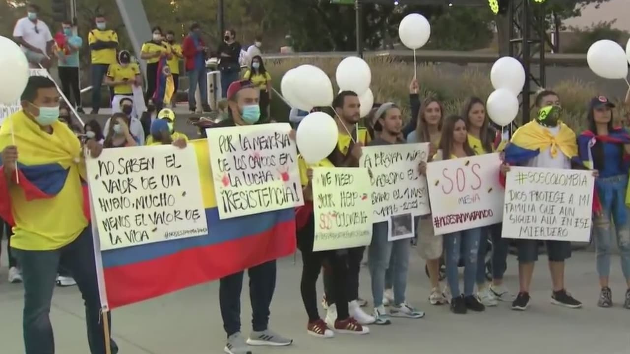 Las protestas desatadas por una reforma tributaria presentada por el presidente Iván Duque se han visto empañadas por al menos 24 muertes, actos vandálicos y denuncias de abuso policiaco. Este miércoles, cientos de personas se dieron cita en Grand Park para unir sus voces y exigir que la violencia en Colombia llegue a su fin y los derechos de todos allí sean protegidos.