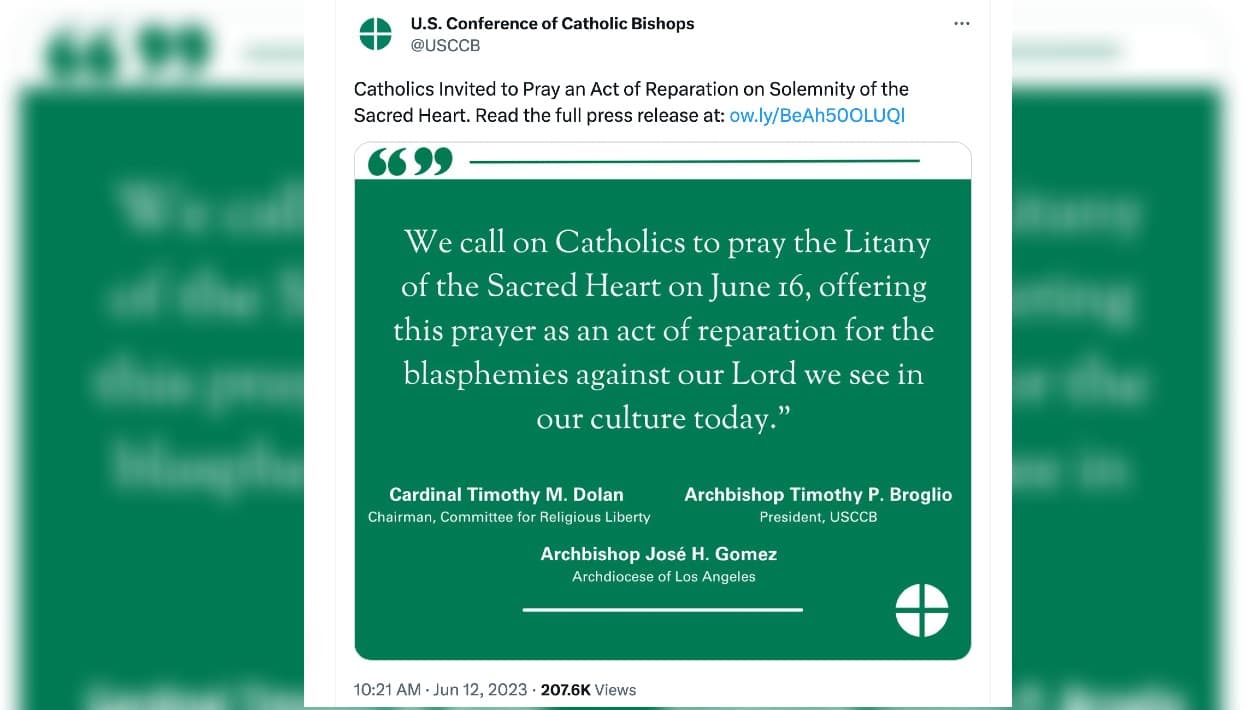 Todo católico, invitan incluso a través de Twitter, como se observa arriba, debe "rezar las Letanías del Sagrado Corazón el 16 de junio, ofreciendo esta oración como un acto de reparación por las blasfemias contra nuestro Señor que vemos en nuestra cultura hoy”.