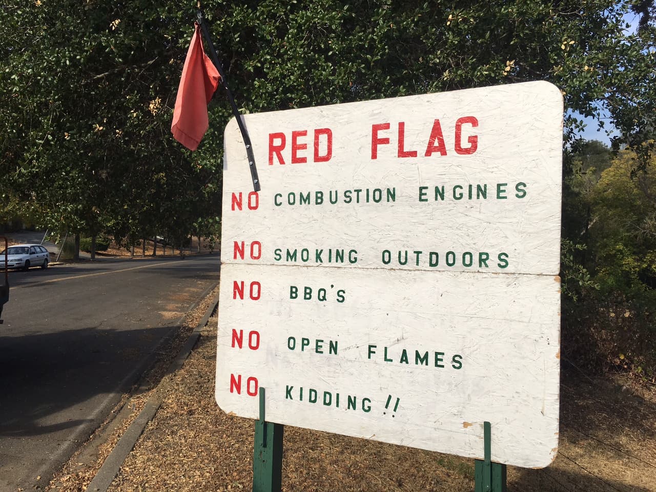 "Bandera roja. No máquinas de combustión. No fumar en exteriores. No asados. No fogatas. No es broma", decía un cartel en la entrada de la diminuta comunidad rodeada de pinos. Por sus dos únicos accesos desde la zona urbana de Napa, hay laderas, árboles y estructuras quemadas.
