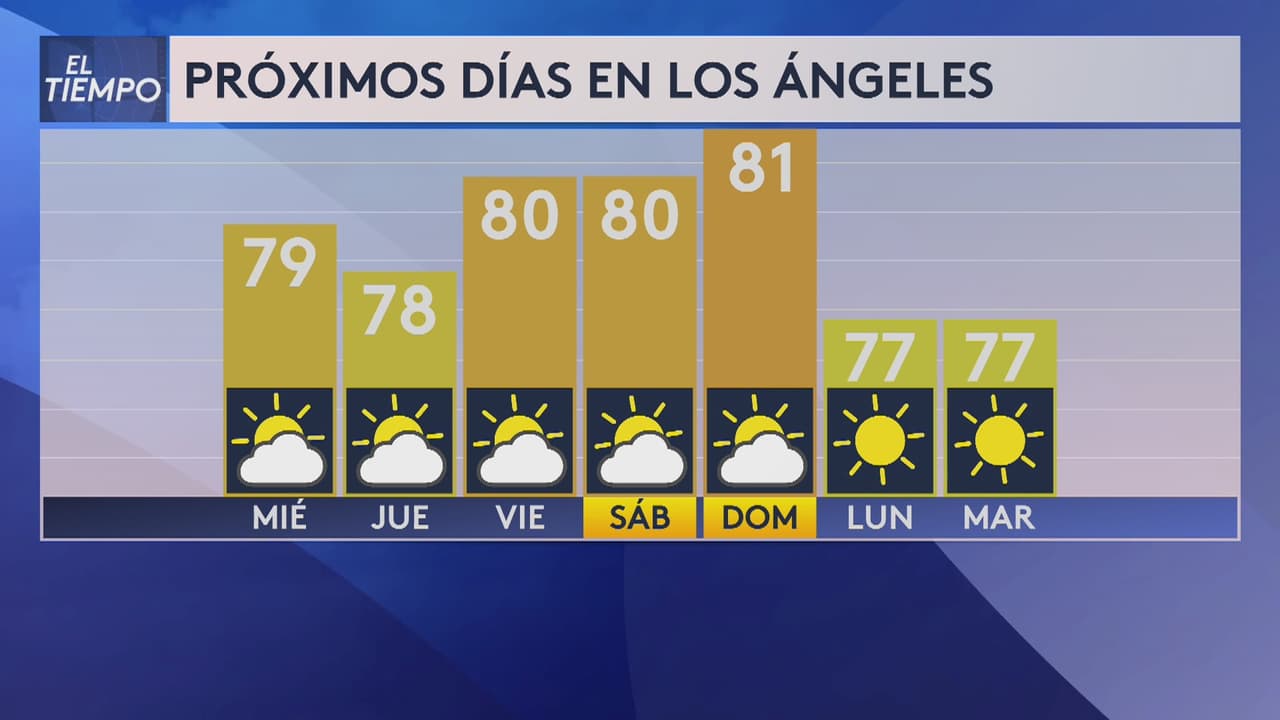 El día comenzará con neblina en las cosas y valles, en donde también se tendrán fuertes vientos. Se pronostica que las temperaturas alcancen un máximo de 79 grados Fahrenheit en Los Ángeles y sus alrededores.