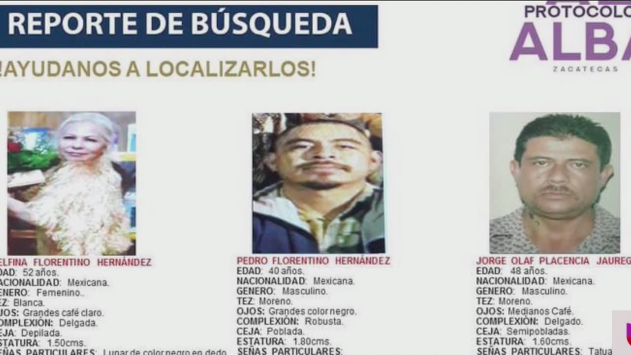 Una publicación de FJEZ en las redes sociales describe a Delfina Florentino Hernández, de 52 años de edad, Pedro Florentino Hernández, de 40 años de edad, y Jorge Olaf Placencia Jáuregui, de 48 años de edad como mexicanos y se encuentran bajo el Protocolo Alba y orden de búsqueda tras su desaparición.