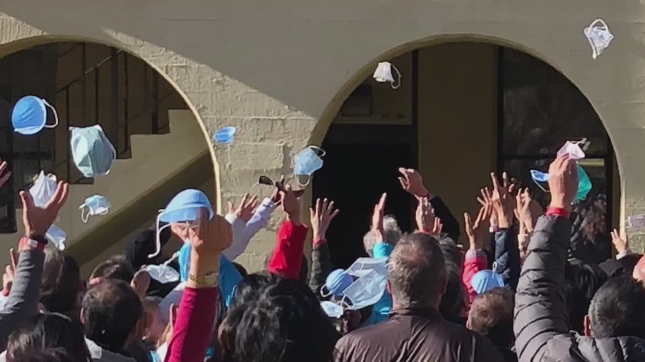Some of the 195 guests toss their face masks in celebration as they prepare to depart March Air Reserve Base. #rivconow #ruhealth #coronavirus pic.twitter.com/vrMIZTa1ez