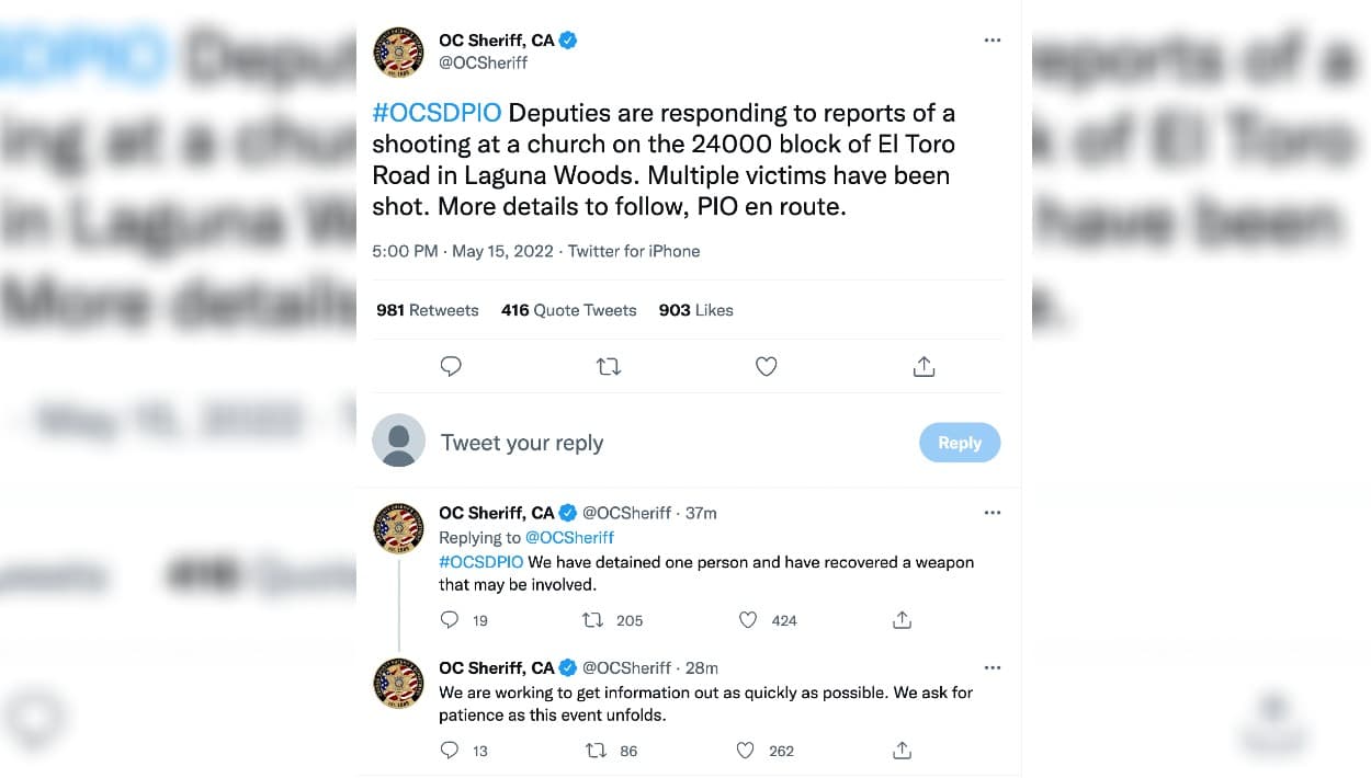 De acuerdo con el Sheriff de OC, una persona está bajo arresto y recuperaron un arma que potencialmente estaría relacionada con el ataque.