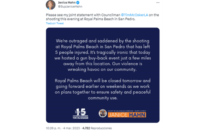 “Estamos indignados y entristecidos por el tiroteo en Royal Palms Beach en San Pedro que ha dejado 5 personas heridas", dijo la supervisora del condado de Los Ángeles, Janice Hahn.